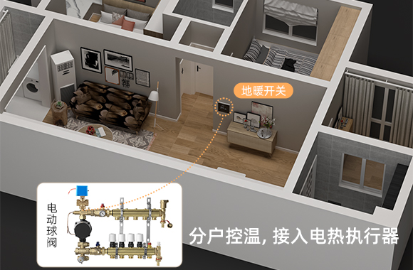 系統(tǒng)主要由鍋爐、水暖溫控器、電動(dòng)閥、集水分水器組成,在集水分水器的每條支路管道上安裝一個(gè)電動(dòng)閥,溫控器來 控制電動(dòng)閥的開和關(guān),鍋爐的熱水流進(jìn)集分水器再從各個(gè)支路流向各個(gè)房間,當(dāng)傳感器所檢測的溫度達(dá)到或高于設(shè)定 溫度時(shí)溫控器控制電動(dòng)閥關(guān)閉,反之,當(dāng)傳感器檢測的溫度低于設(shè)定溫度時(shí),溫控器控制電動(dòng)閥開啟,如此循環(huán)工作。
